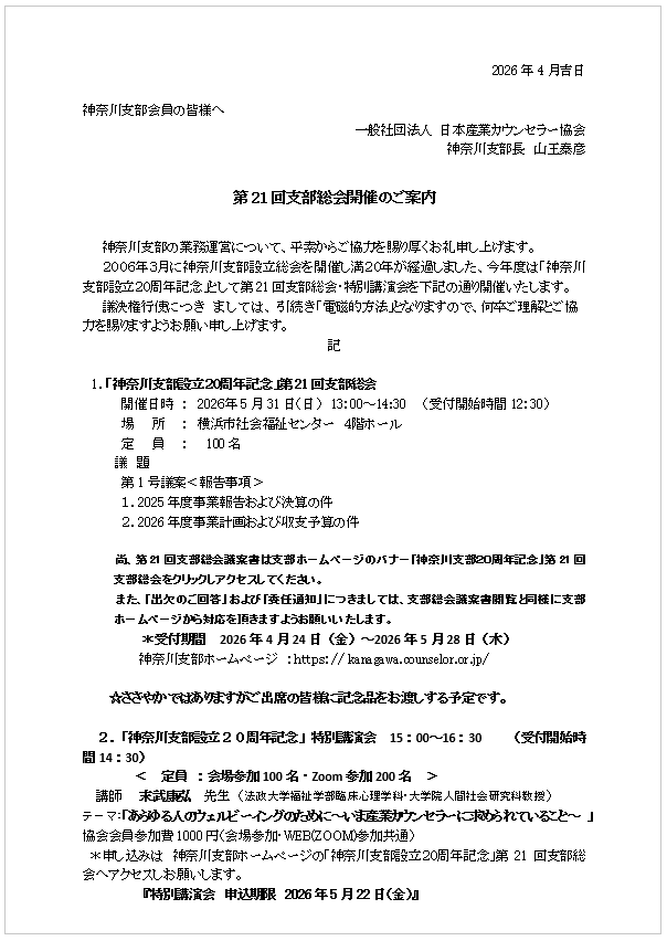 一般社団法人日本産業カウンセラー協会 神奈川支部 講演会・研修会の開催や相談室でのカウンセリングを行っております。