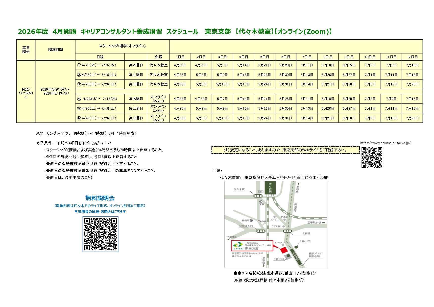 東京支部 開催会場 4月スクーリング日程表(代々木・オンライン木曜)